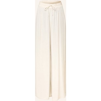 Hohe Leibhöhe. Gerades, weites Bein. Elastischer, geraffter Taillenbund mit Tunnelzug. Dekorative Knopfleiste vorne. Nadelstreifen-Optik. Dezente Crinkle-Optik. Fließende, leichte Materialqualität
