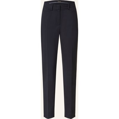 Hohe Leibhöhe. Schmal zulaufendes Bein. Schließt mit Haken, Knopf- und Reißverschluss. Figurschmeichelnde Bügelfalten. Seitliche Eingrifftaschen. Dekorative Leistentaschen. Elastische Verarbeitung