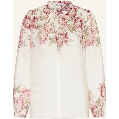 Gerader Schnitt. Stehkragen mit Bindebändern. Schließt mit kurzer Knopfleiste. Raffungen an der Schulterpartie. Ballonärmel. Elastische Ärmelenden. Florales Muster. Reines Leinen