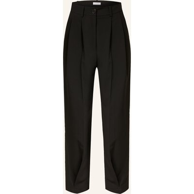 Hohe Leibhöhe. Schmal zulaufendes Bein. Schließt mit Knopf und Reißverschluss. Bundfalten und Bügelfalten. Seitliche Eingrifftaschen. Leistentasche am Gesäß. Fließende Haptik