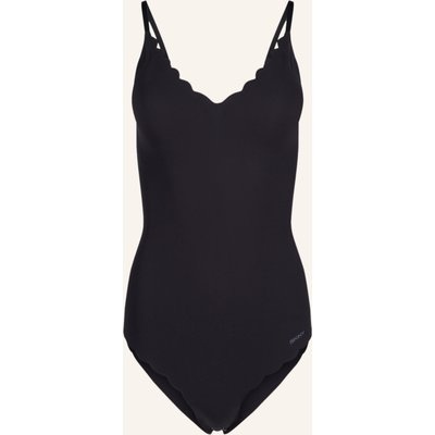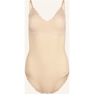 Körpernaher Schnitt. Blickdichte Verarbeitung. V-Ausschnitt. Mit herausnehmbaren Polstern. Bügellos. Ohne seitliche Formstäbchen. Verstellbare Spaghetti-Träger. Baumwollzwickel. Vollständige Bedeckung des Pos. Druckknöpfen im Schritt. Nahtlose Verarbeitung. Wellkante an den Abschlüssen. Label-Schriftzug vorne