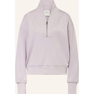 Gerader, weiter Schnitt. Anliegender Stehkragen. V-Ausschnitt mit kurzem Reißverschluss. Überschnittene Schultern. Bündchen an Ärmeln und Saum. Label-Flag in der Seite. 2-Wege-Stretch. Leichtgewichtige Verarbeitung. Sehr softe Haptik